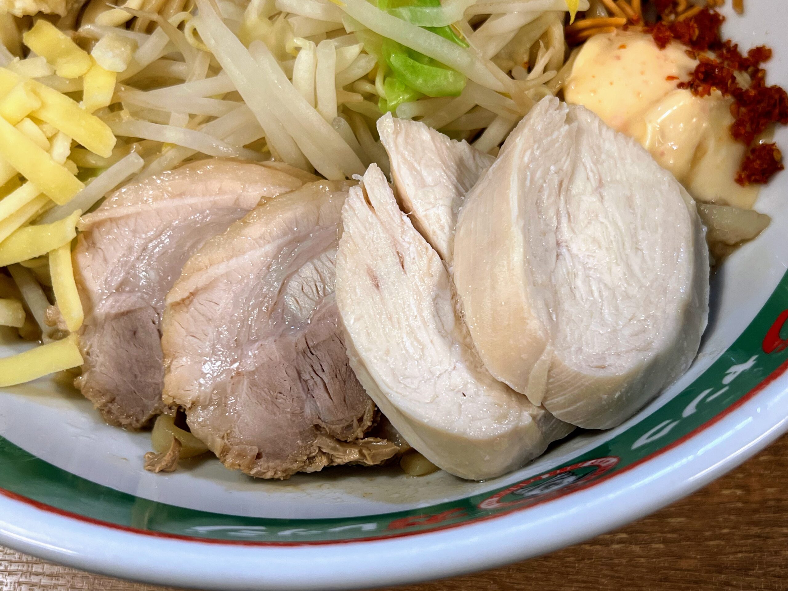 - 鶏と豚のチャーシュー: このまぜそばには、鶏チャーシューと豚チャーシューが両方使用されています。鶏チャーシューはさっぱりとした味わいで、豚チャーシューはジューシーで濃厚な旨味を持ち、二つの味わいが一つの丼で楽しめます。