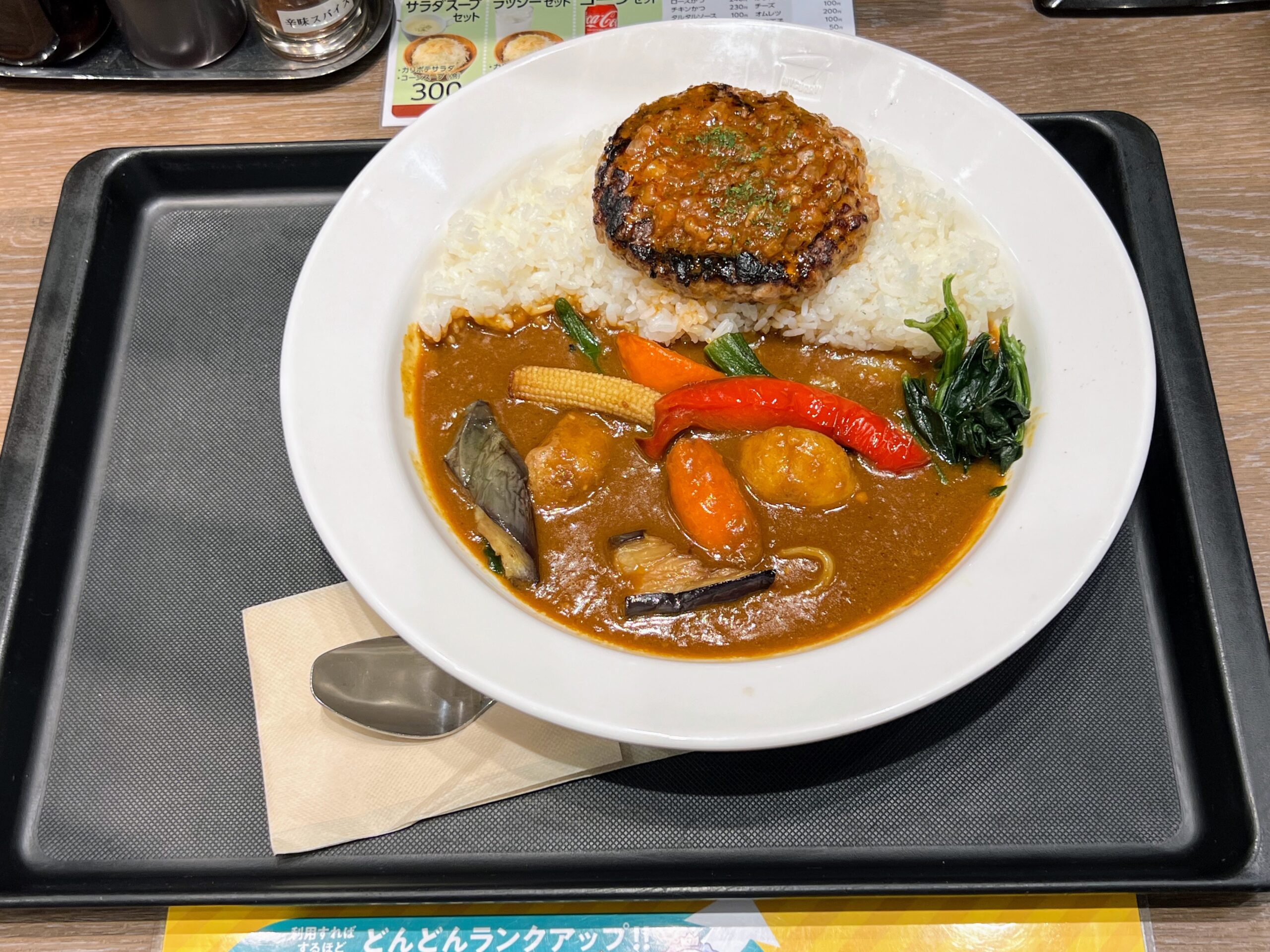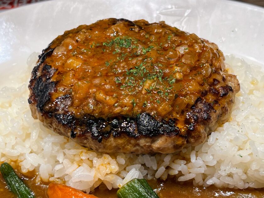 前回のデミソースハンバーグとはまた違った味わいで、カレーとの相性もほどほどに良いですね。チミチュリソースとカレーソースの2種のソースがうまく組み合わさって、妙な辛さを生み出しているのです。さらにはボリュームもたっぷりで、味も量も大満足の一皿と言えます。