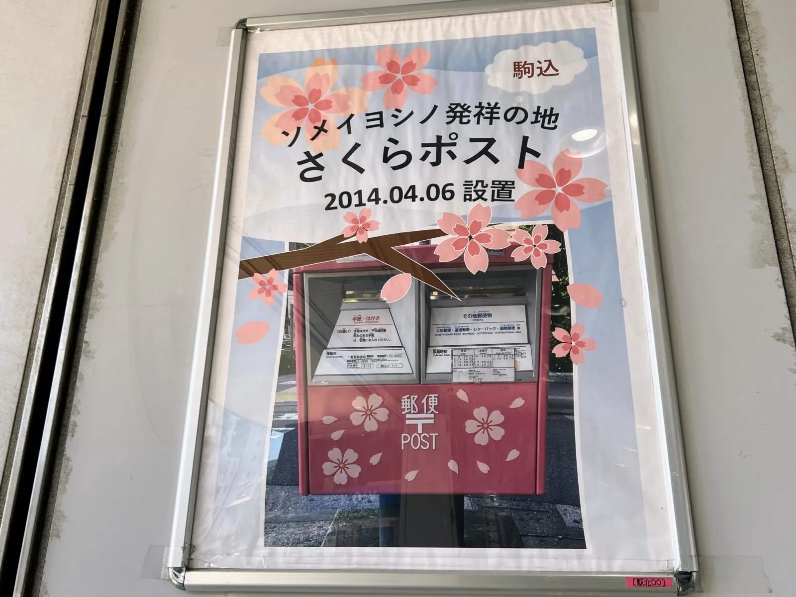 2014年4月、東京都豊島区にありますJR駒込駅(山手線)の北口において、「桜(ソメイヨシノ)」がデザインされたピンク色の郵便ポストが設置されております。こちらは、駒込がソメイヨシノ発祥の地とされていることにちなんだものとなっています。