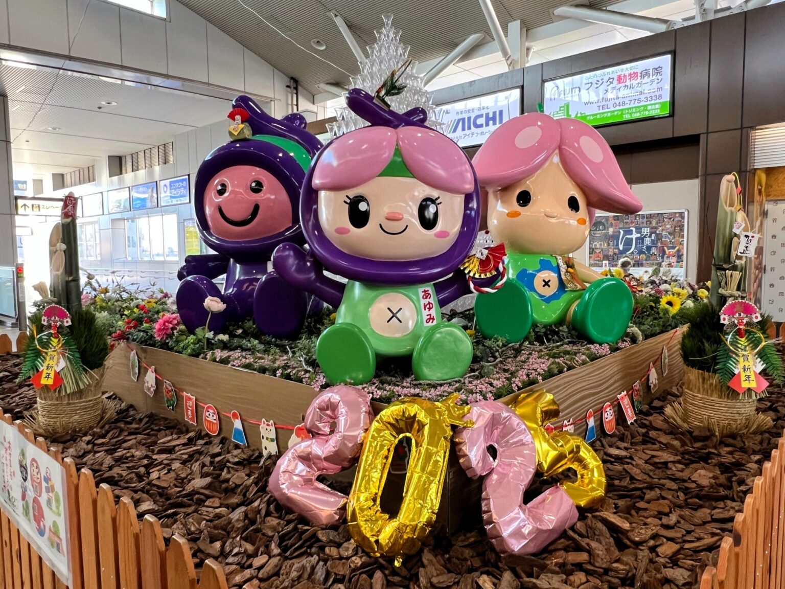 【ゆるキャラ】2025年謹賀新年装飾をまとった「アッピー」「あゆみ」「まゆみちゃん」の像(JR上尾駅)【埼玉県上尾市】