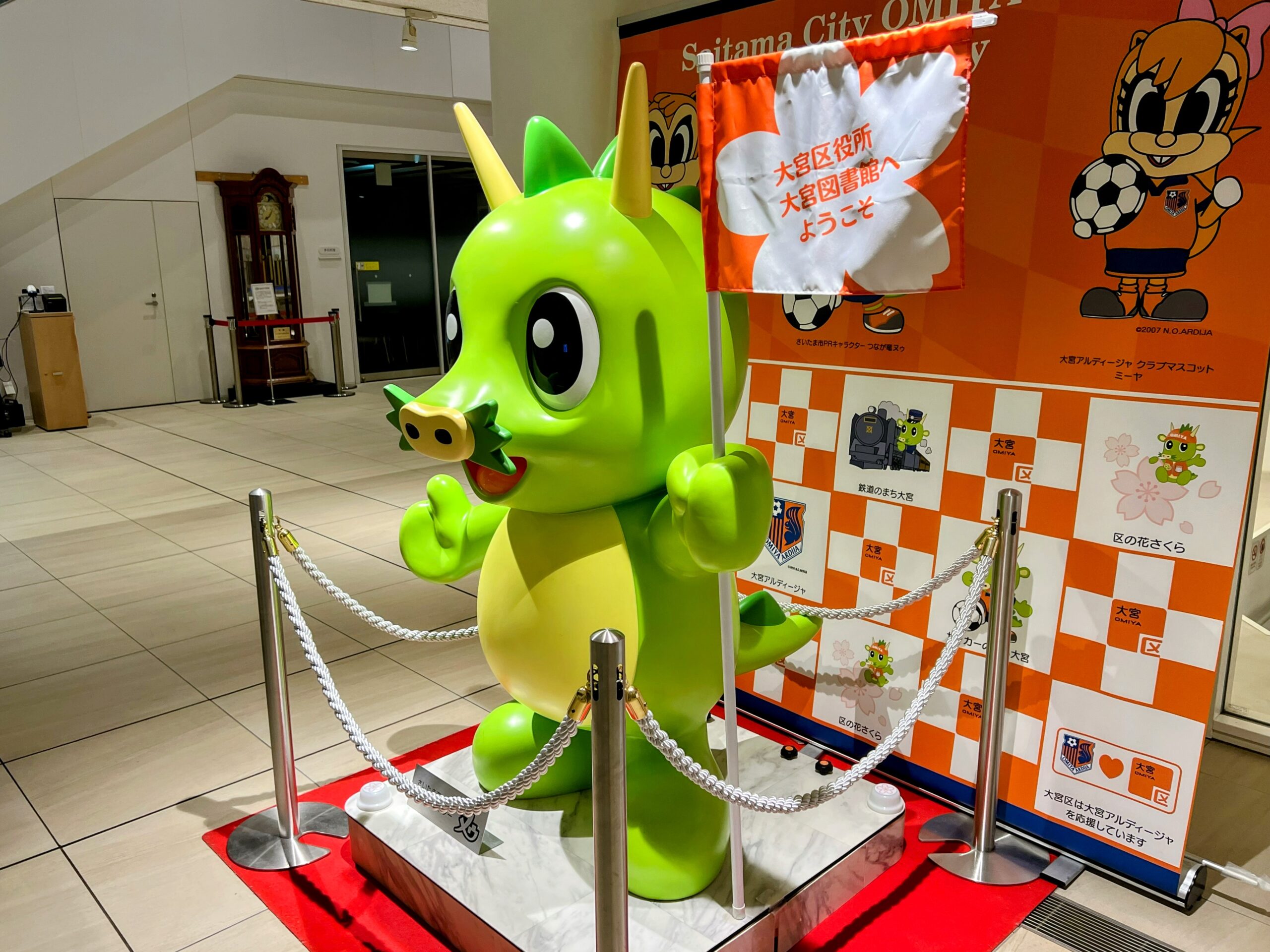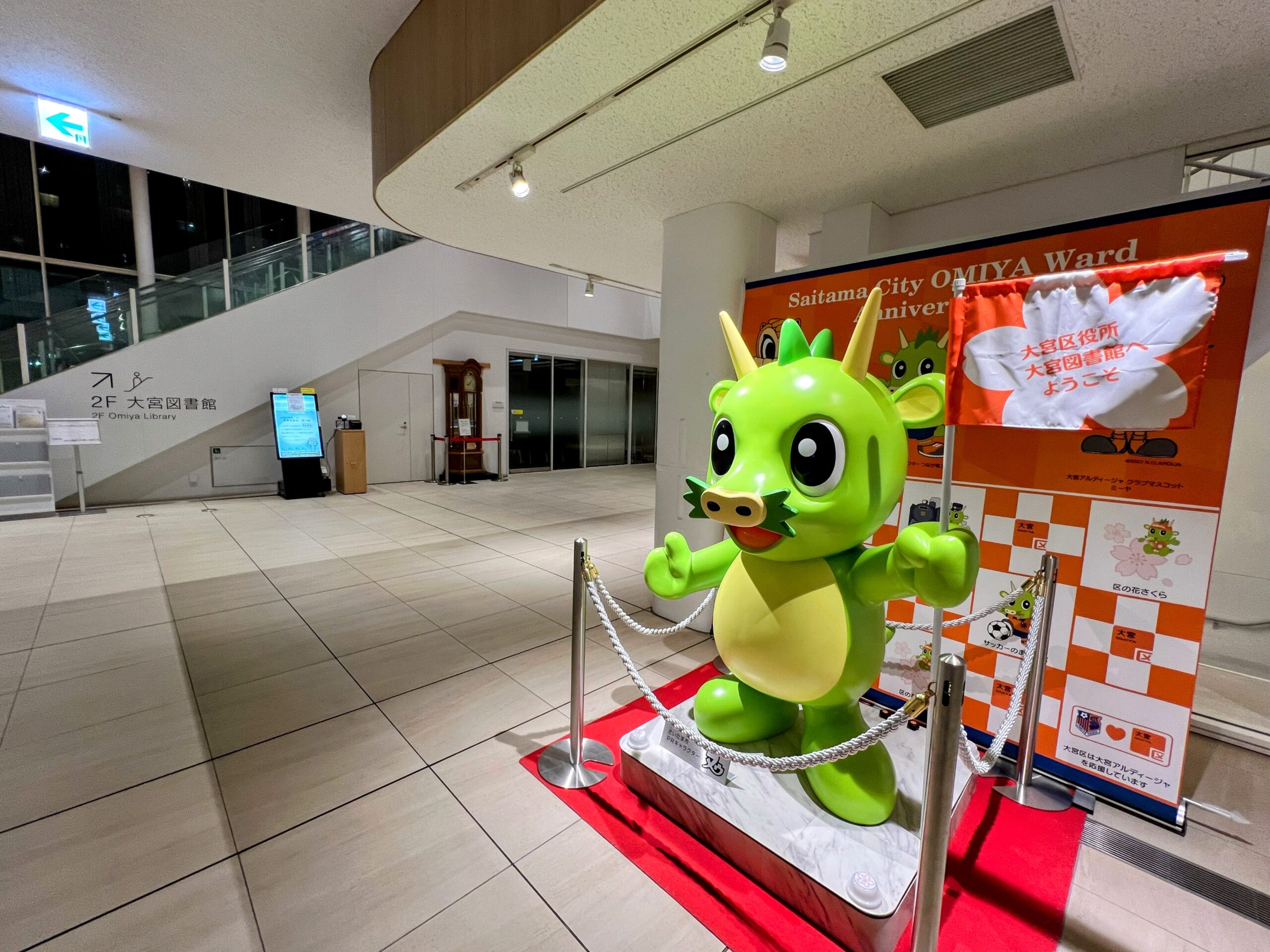 さいたま市立大宮図書館(さいたま市大宮区)兼大宮区役所の1階、正面入口から入ってすぐのところに、さいたま市PRキャラクター「つなが竜ヌゥ」の特大フィギュアが設置されております。2023年11月中旬に設置されたとのことで、さいたま市の区制成立20周年を記念しての事業の一環ということですね。