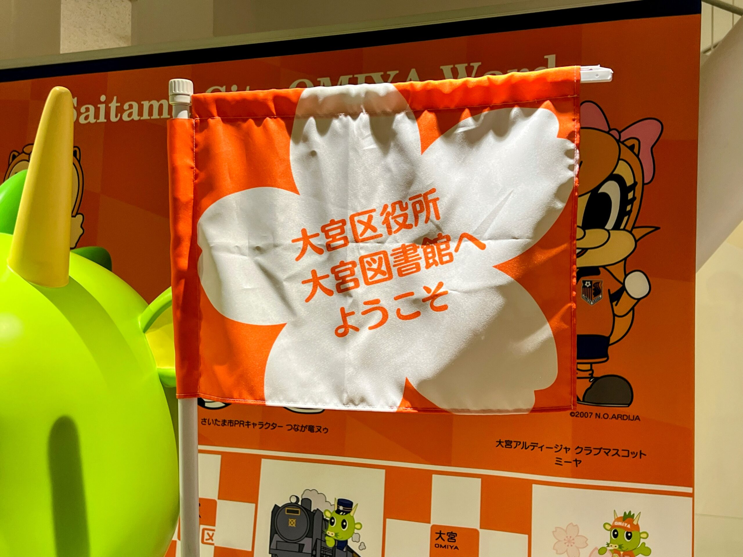 大宮図書館の「つなが竜ヌゥ」特大フィギュア・フラッグ拡大(2024年11月撮影)