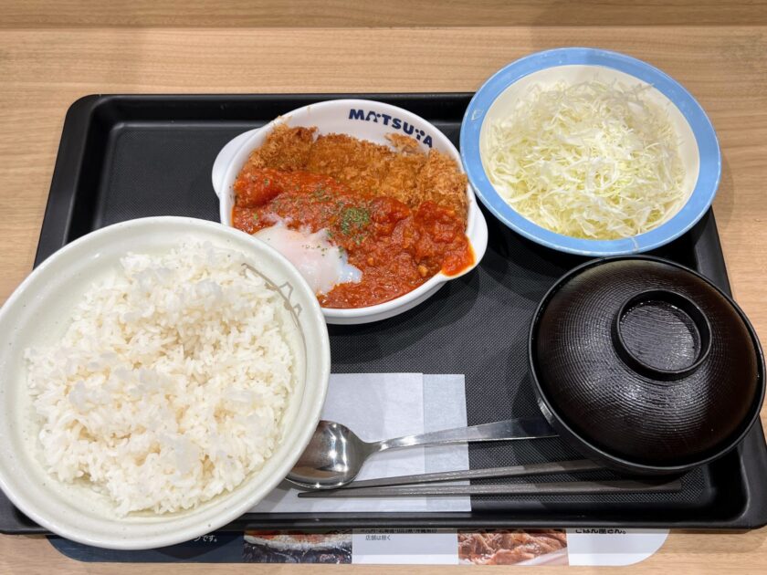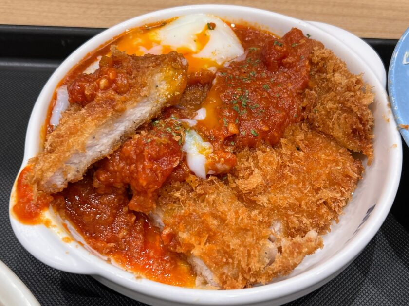 松屋定番メニュー「うまトマハンバーグ」でお馴染みの「うまトマソース」と松のや定番「ロースかつ」を合わせるという、ありそうでなかなか無かったメニューです。これが美味しくないはずはなく、ご飯との相性も抜群です。うまトマハンバーグ同様に半熟玉子が付いているのも良いですね。派生メニューとしてこれ以上無いくらいの出来ですし、販売期間中にもう1度か2度くらいリピートしたくもなります。