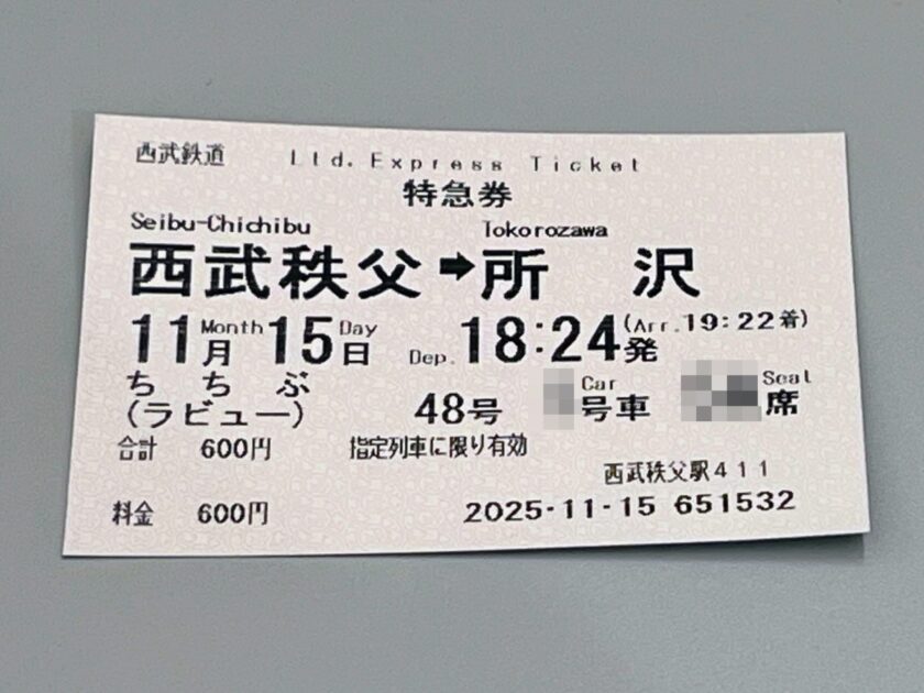 乗車経路西武秩父線 西武秩父 → 西武池袋線 飯能 → 所沢