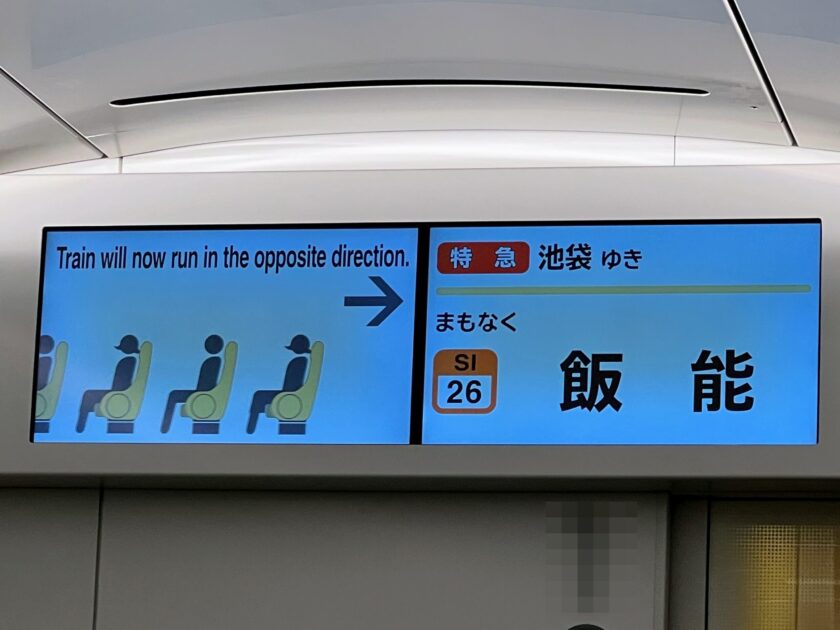 飯能駅到着前、スイッチバック予告案内表示(左)