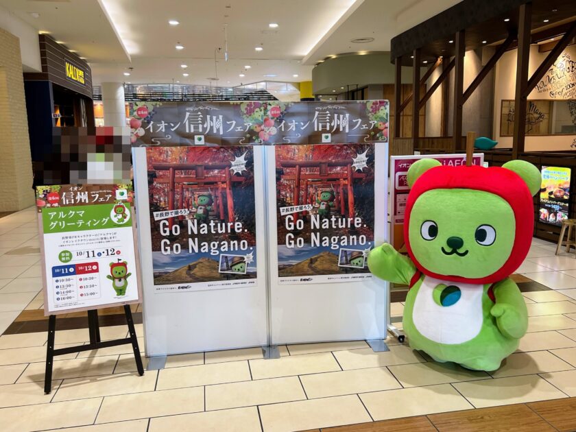 2025年10月9日(木)から13日(月・祝)までの5日間、埼玉県越谷市のイオンレイクタウンmoriにおいて「第6回イオン信州フェア」が開催されておりました。その一環として、10月11日(土)・12日(日)の2日間、長野県PRキャラクター「アルクマ」と長野県飯綱町公式キャラクター「みつどん」によるグリーティングが行われておりました。