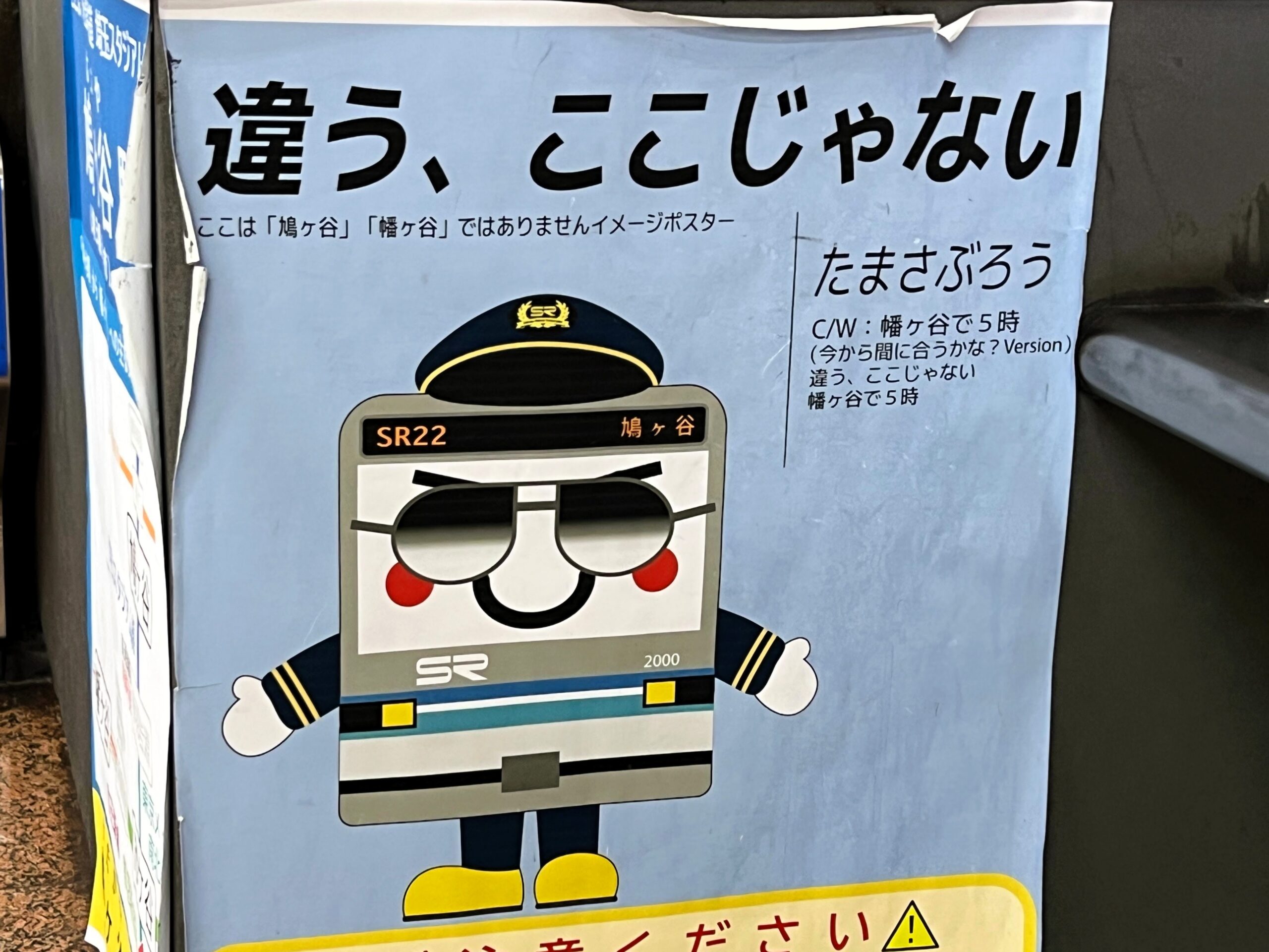 埼玉高速鉄道の鳩ヶ谷駅、改札内において掲げられている、「違う、ここじゃない」という題名のポスター。2024年6月にX(旧Twitter)でも一躍話題になりましたが、今でも確認することが可能となっております。ご丁寧にも改札手前で掲示されており、注意喚起としてうってつけの箇所でございますね。