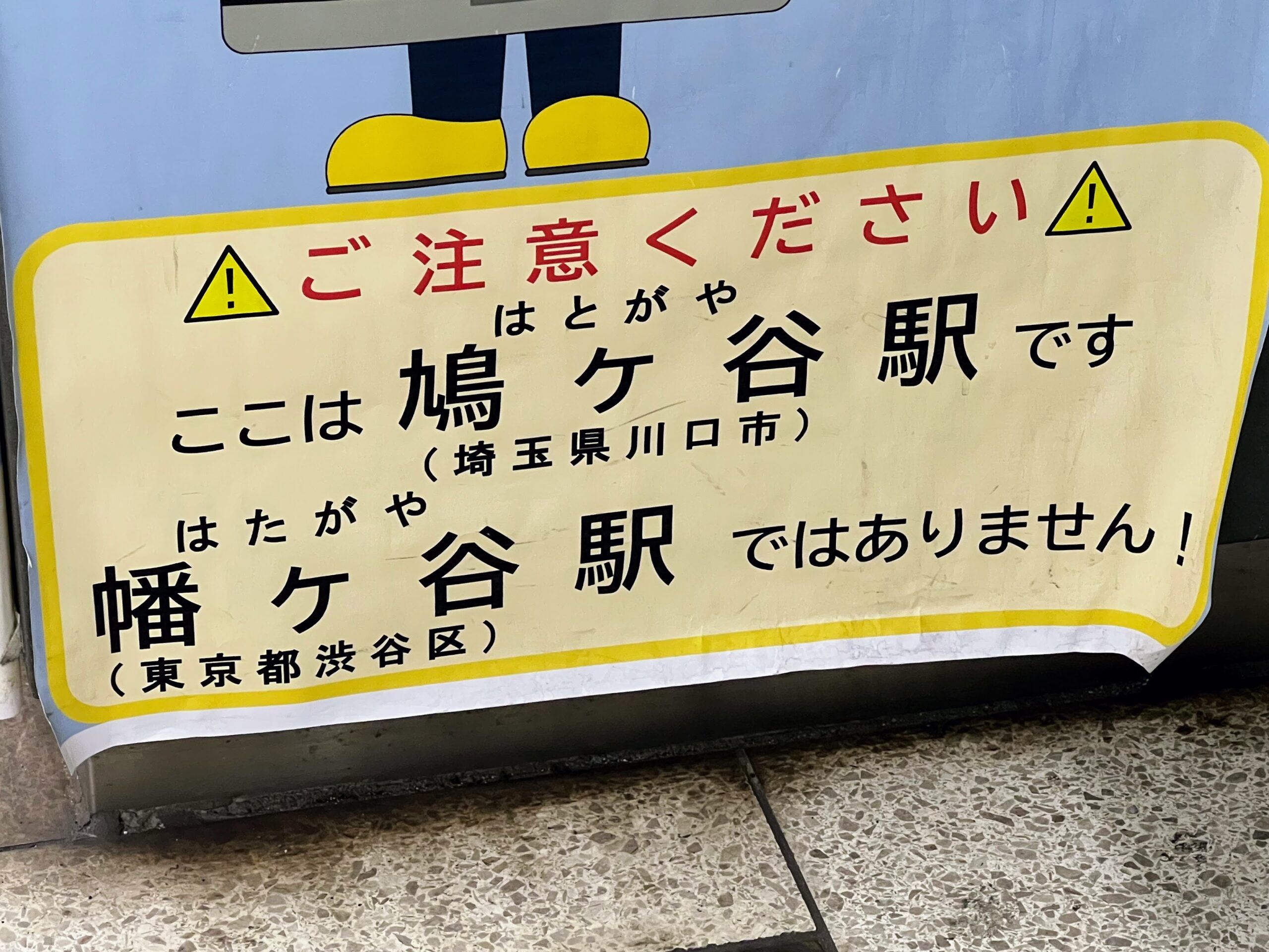 何を注意喚起しているかといえば、字のごとくでございます。すなわち、鳩ヶ谷駅(埼玉県川口市・はとがや)であり、幡ヶ谷駅(東京都渋谷区・京王線・はたがや)ではないということです。よくある地名の混同ネタの1つですね。