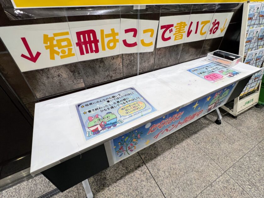 何と言うことはない、短冊に願い事を書くためのスペースなのですが、七夕ならではの季節感のある一場面でもありました。おそらく駅独自の取り組みなのでしょうが、たとえそうでなかったとしても、このようなことをやってくださっているだけでも親近感が湧いてくるというものです。