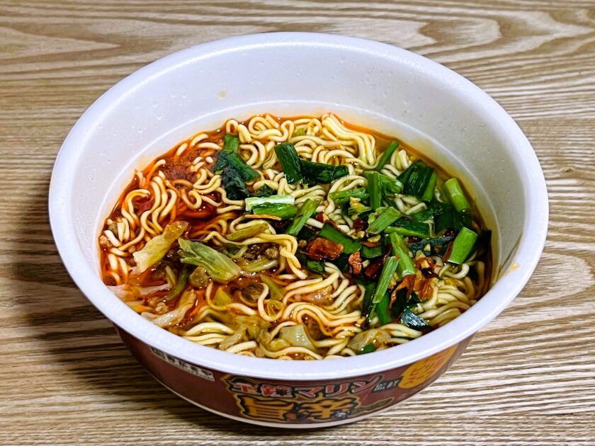 肝心の味についてですが、「250円から300円くらいのちょい高めな即席カップ麺」を想像していただけると良いのかな、と思います。ノンフライ麺であるだけに、味は悪くはありません。ただ、「旨辛」と表記のあるとおり、味は少々辛めです。一般的な「辛ラーメン」として売り出されている即席カップ麺を想起いただけると良いかと思います(さすがに「蒙古タンメン中本」ほどではないですが)。