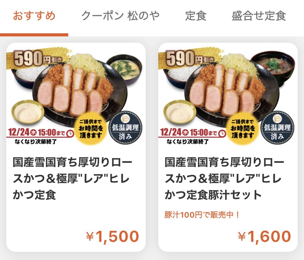 【松のや】新規販売メニューの記録:「国産雪国育ち厚切りロースかつ定食」「極厚”レア”ヒレかつ定食」など(2025年12月分) – いちごいちえ