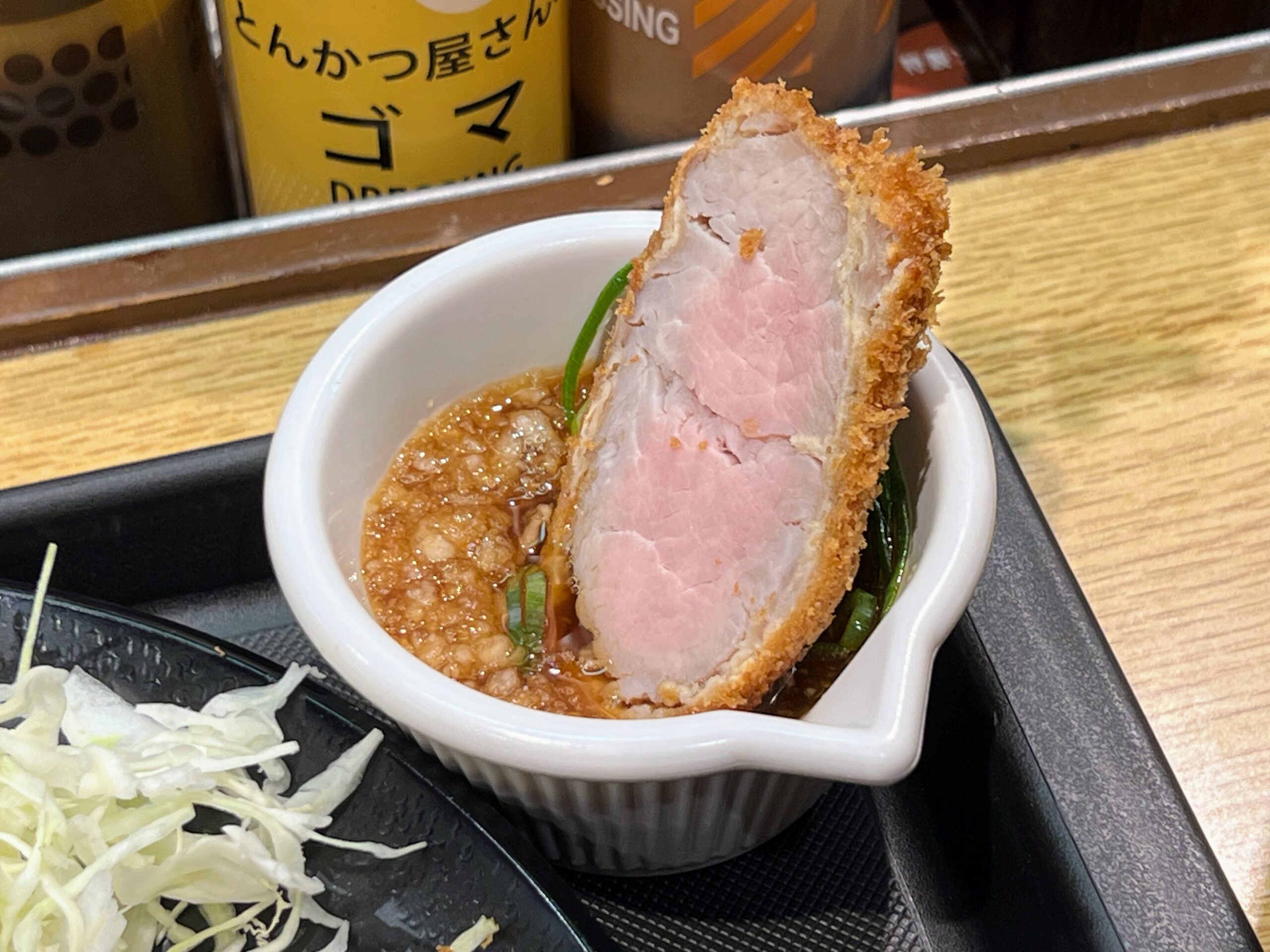 ただでさえ「国産雪国育ち厚切りロースかつ」も「極厚”レア”ヒレかつ」も美味しいのに、それらを組み合わせるとなれば、嬉しくないわけがありません。クリスマスの時期にぴったりの、「松のや」ならではのプレゼントメニューとなっております。なお、前回の「極厚”レア”ヒレかつ」ではタルタルソースを選びましたので、今回は「ミニ鬼おろしポン酢」を選びました。相性としてはほどほどだったと思います。