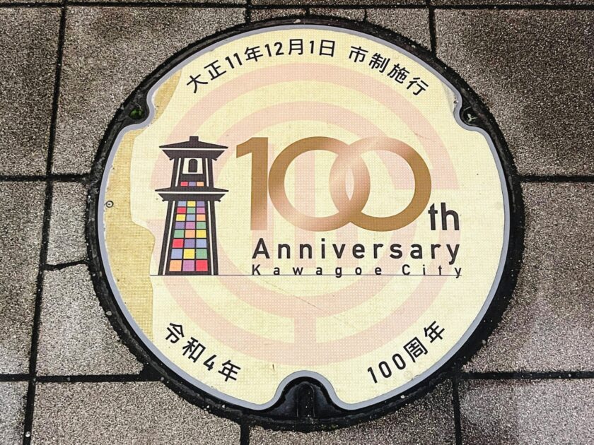 川越市は、1922年(大正11年)に埼玉県で初めてとなる市制を制定、誕生しております。それから100周年を迎えた2022年(令和4年)、市制施行100年を祝うためにマンホールが市内数カ所に設置されました。もともとは背景が白かったようですが、メンテナンスが行き届いていなかったかたまたま撮影時の状況が悪かったのか、少々黄ばんでいるのが気にかかります。よく見ると、マンホール左側の方に目立った剥がれがあるのも気になります。
