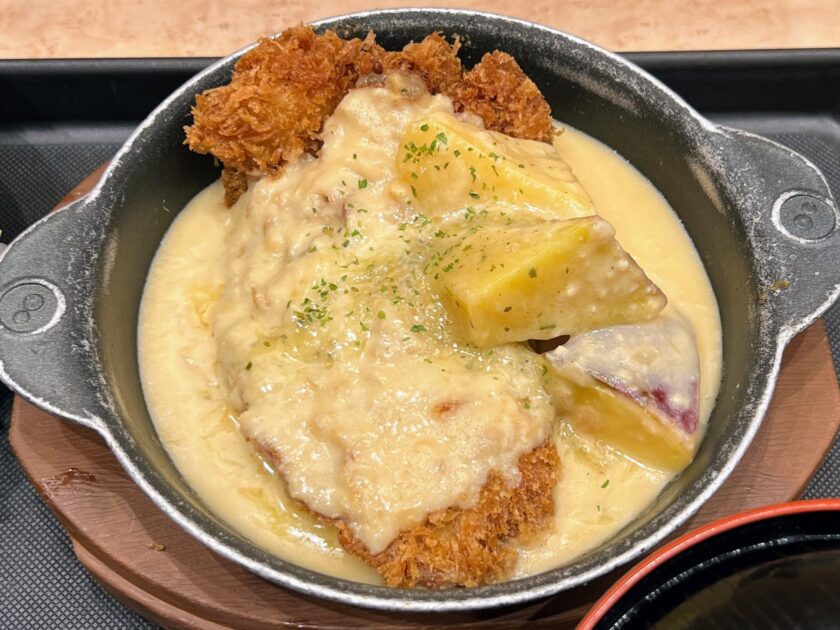 こちらは松屋の「シュクメルリ鍋」の鶏肉を「チキンかつ」に置き換えたものになります(ポスターでも「松屋」のシュクメルリソースを使用していることを謳っています)。従来の鶏の煮込み風なのも良いですが、美味しいチキンカツにシュクメルリソースをかけて食べるのも良いものですよね。少々意外性はあるものの、やはりもともとのシュクメルリが美味しいので、こちらのメニューも実に美味しくいただけました。