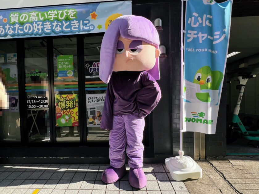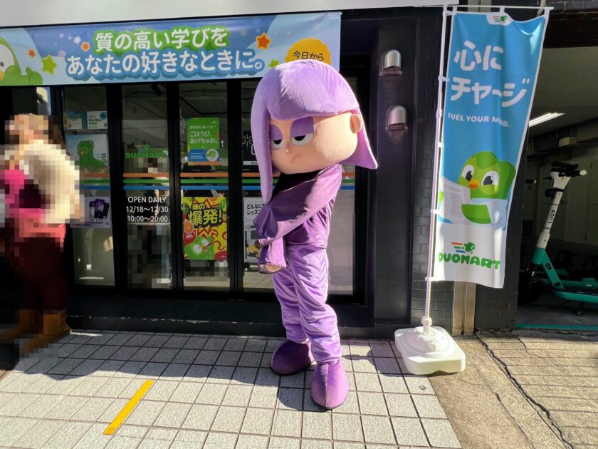 2025年12月30日(火)、東京都渋谷区の「DUOMART」(OPENBASE SHIBUYA)において、語学学習アプリ「Duolingo」のキャラクターの1名「Lily(リリー)」が登場しておりました。こちらも半目状態、女性にしては声が割と低音であり、気怠そうな性格などの特徴的なキャラクターのため、こちらも結構な人気があるようです。