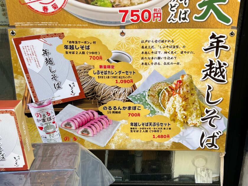 「本家しぶそば 渋谷道玄坂店」店頭の年越しそばメニュー表(2025年12月時点)
