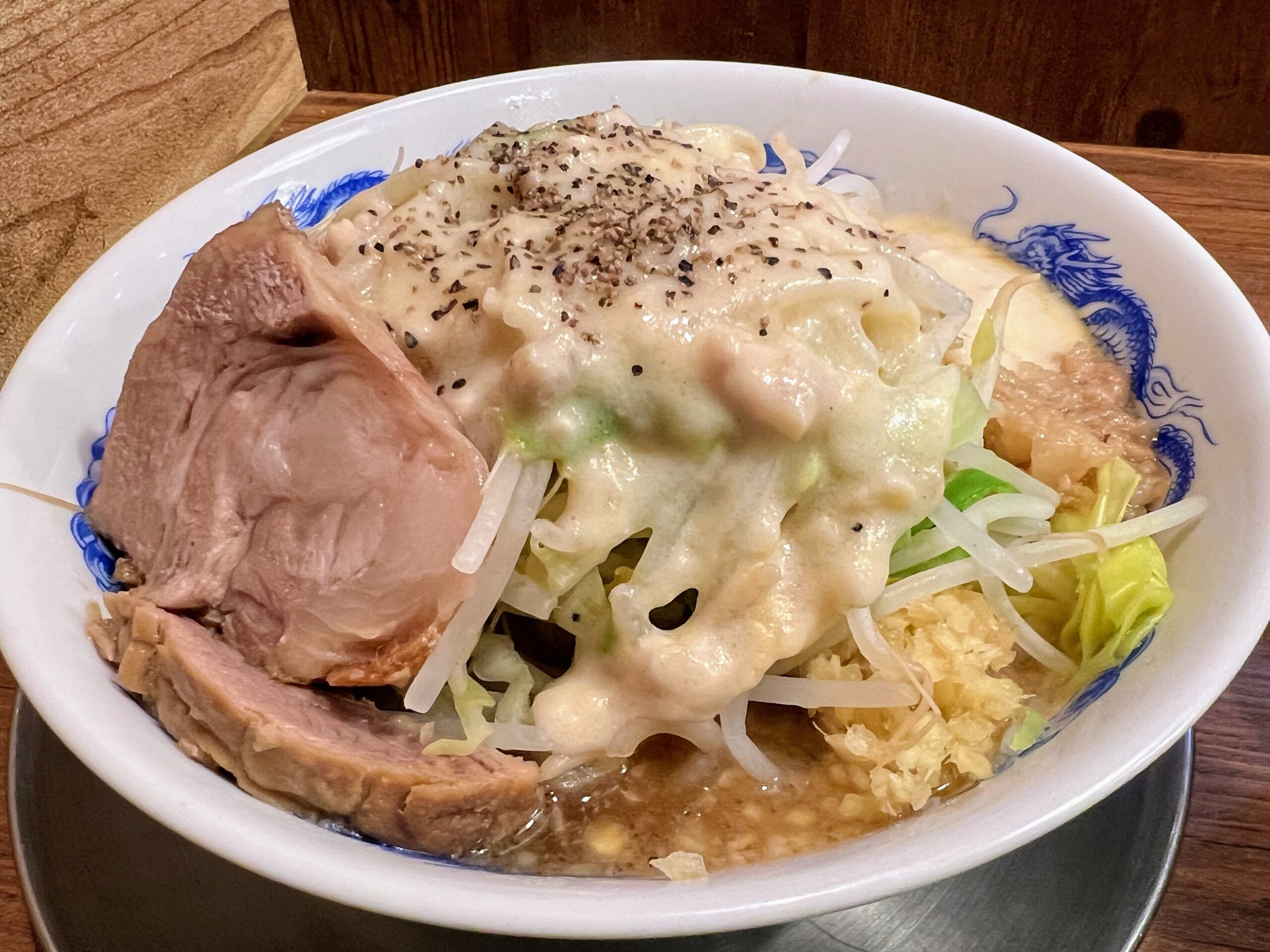 2025年12月17日(水)より期間限定で販売開始しているラーメンです。通常の「ジャンクガレッジ」ラーメンの野菜の上にとろとろのクリームスープをかけた上、ガーリックペッパーを振りかけたものとなっております。