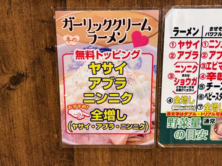 ガーリック風味のクリームスープが、野菜やチャーシュー、極太麺などと実に良く合うのですね。おそらくマッチするまでに試行錯誤を繰り返したものと思われますが、それだけ素晴らしいものに仕上がっていると思っております。また、無料で追加でニンニクを足すことにより、さらにガーリック感の増した味わいを楽しめるので、実に良いですね。寒い冬場だからこそ、あったかクリームやニンニクの力で温かくなれる、とても美味しい一杯となっております。