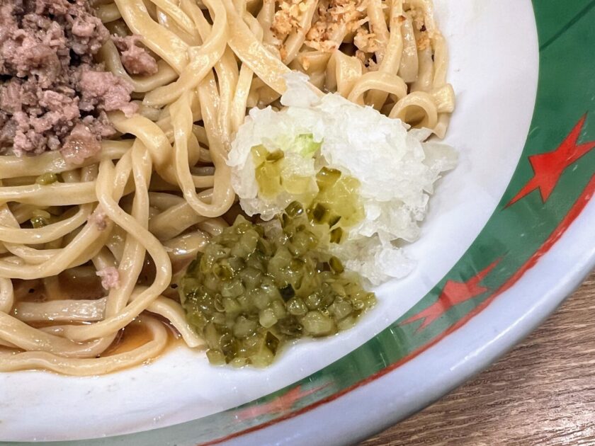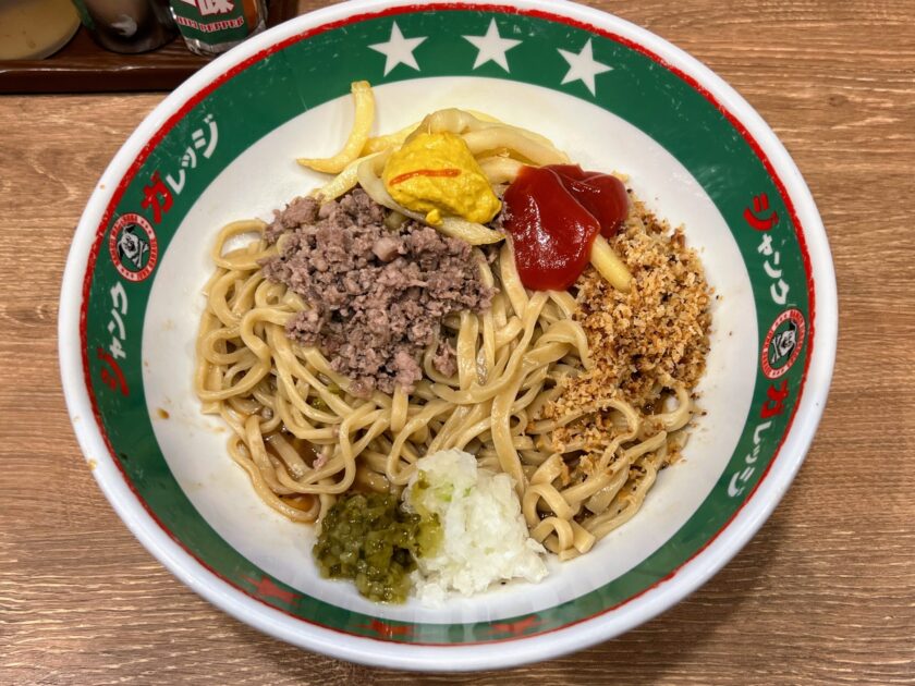 2025年12月24日(水)より、ジャンクガレッジ大宮駅前店のみで販売開始している「まぜそば」です。トッピングやソースがとにかくバーガー関連尽くしとなっているのが何よりの特徴です。もともと2025年10月・11月に東京都の大久保公園で開催された「大つけ麺博」において、ジャンクガレッジの出店期間中にブースで提供されていたものだそうで1、今回大宮駅前店に限り復刻販売する形となっております。
