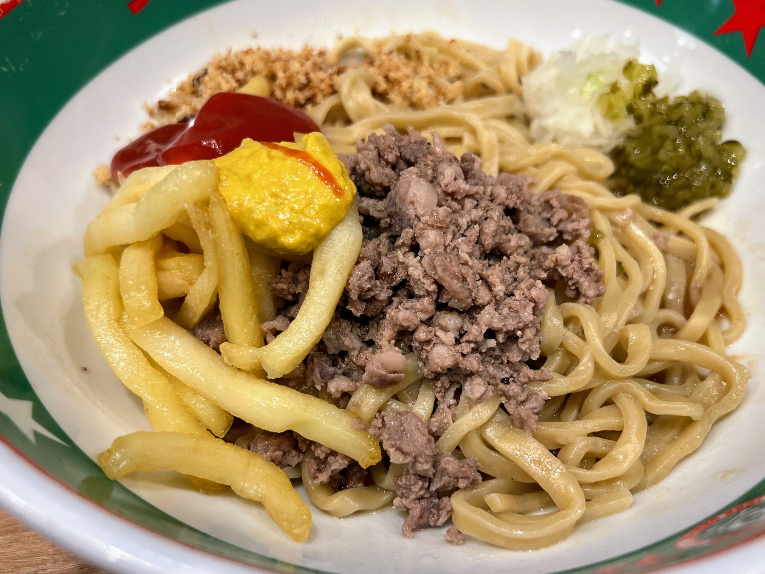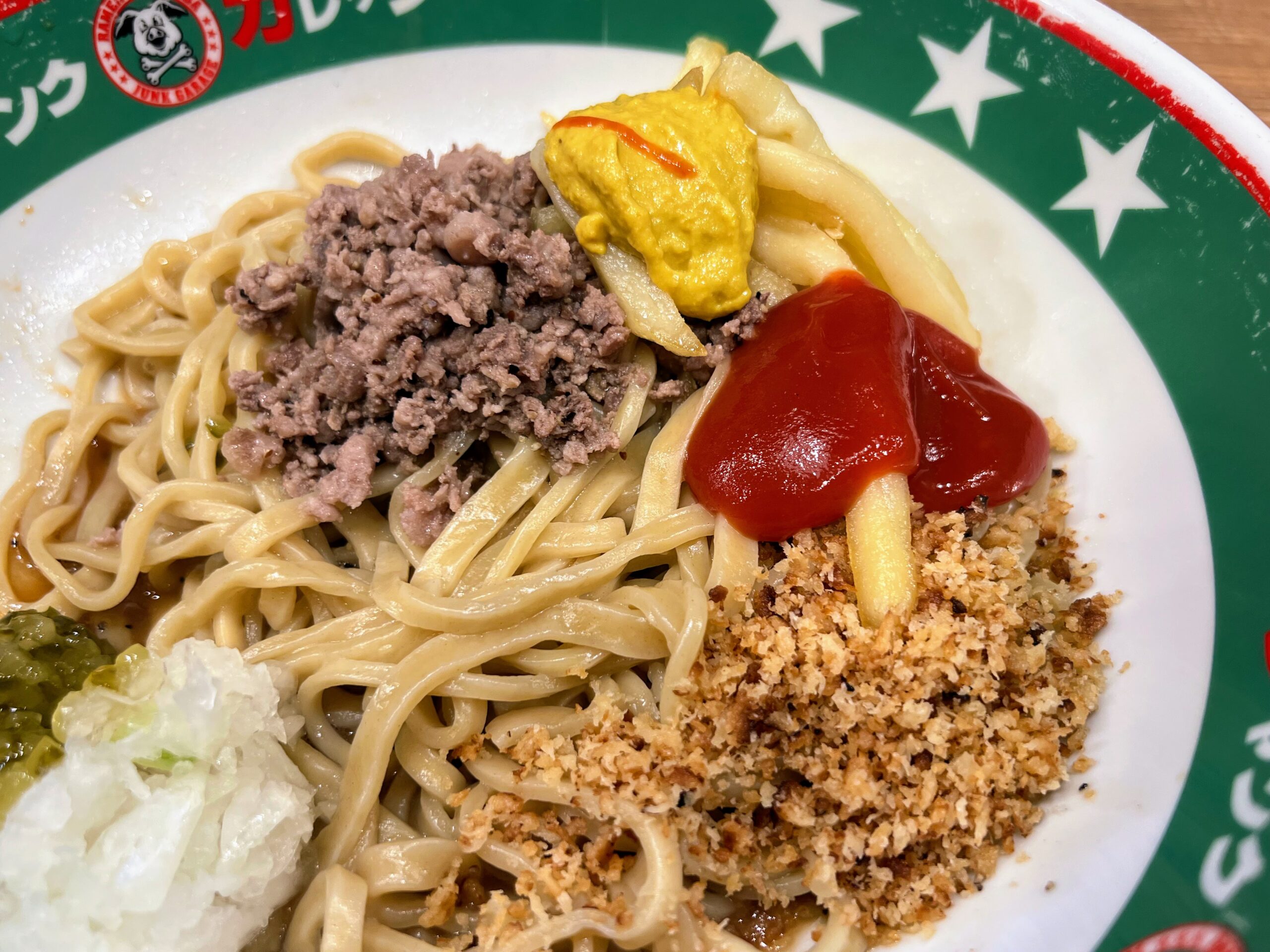 2025年12月24日(水)より、ジャンクガレッジ大宮駅前店のみで販売開始している「まぜそば」です。トッピングやソースがとにかくバーガー関連尽くしとなっているのが何よりの特徴です。もともと2025年10月・11月に東京都の大久保公園で開催された「大つけ麺博」において、ジャンクガレッジの出店期間中にブースで提供されていたものだそうで1、今回大宮駅前店に限り復刻販売する形となっております。