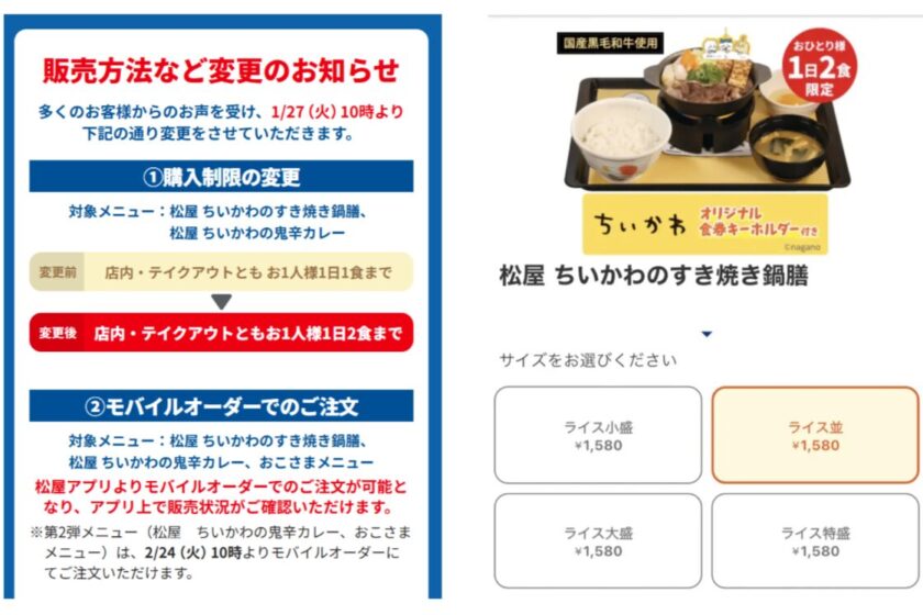 「松屋のすき焼き鍋でなければいけない」という思いが強かったり、「ちいかわ」コンテンツに愛着が強かったりするのでもなければ、無理に何度も食べる必要はないと思います。販売方法の関係上、モバイルオーダー等の実績にはなりません。