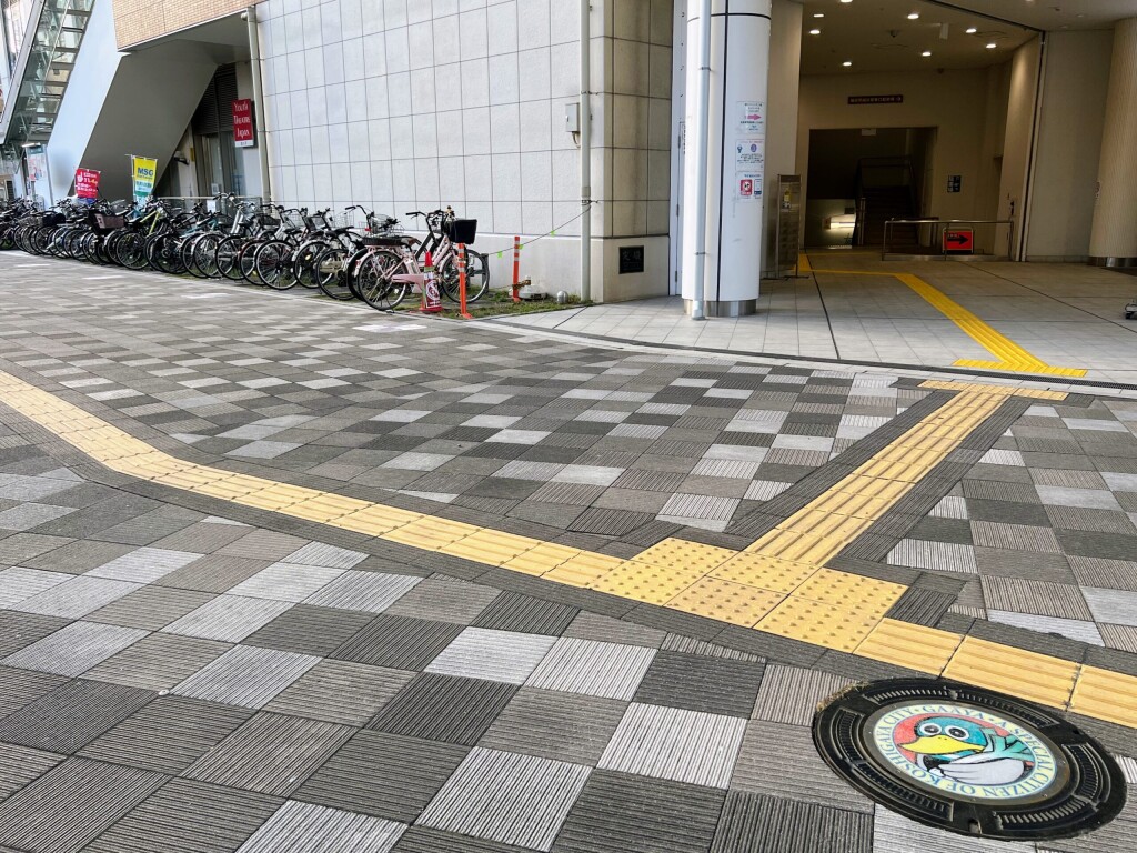 今回撮影したマンホールは、越谷駅の東口を出て、右手前の方に設置されています。商業施設や点字ブロック、バス乗り場など、目印になりそうなものはたくさんあります。また、土産物屋「ガーヤちゃんの蔵屋敷」を背にしながら進んでいく、と覚えておいても良いかも知れません。