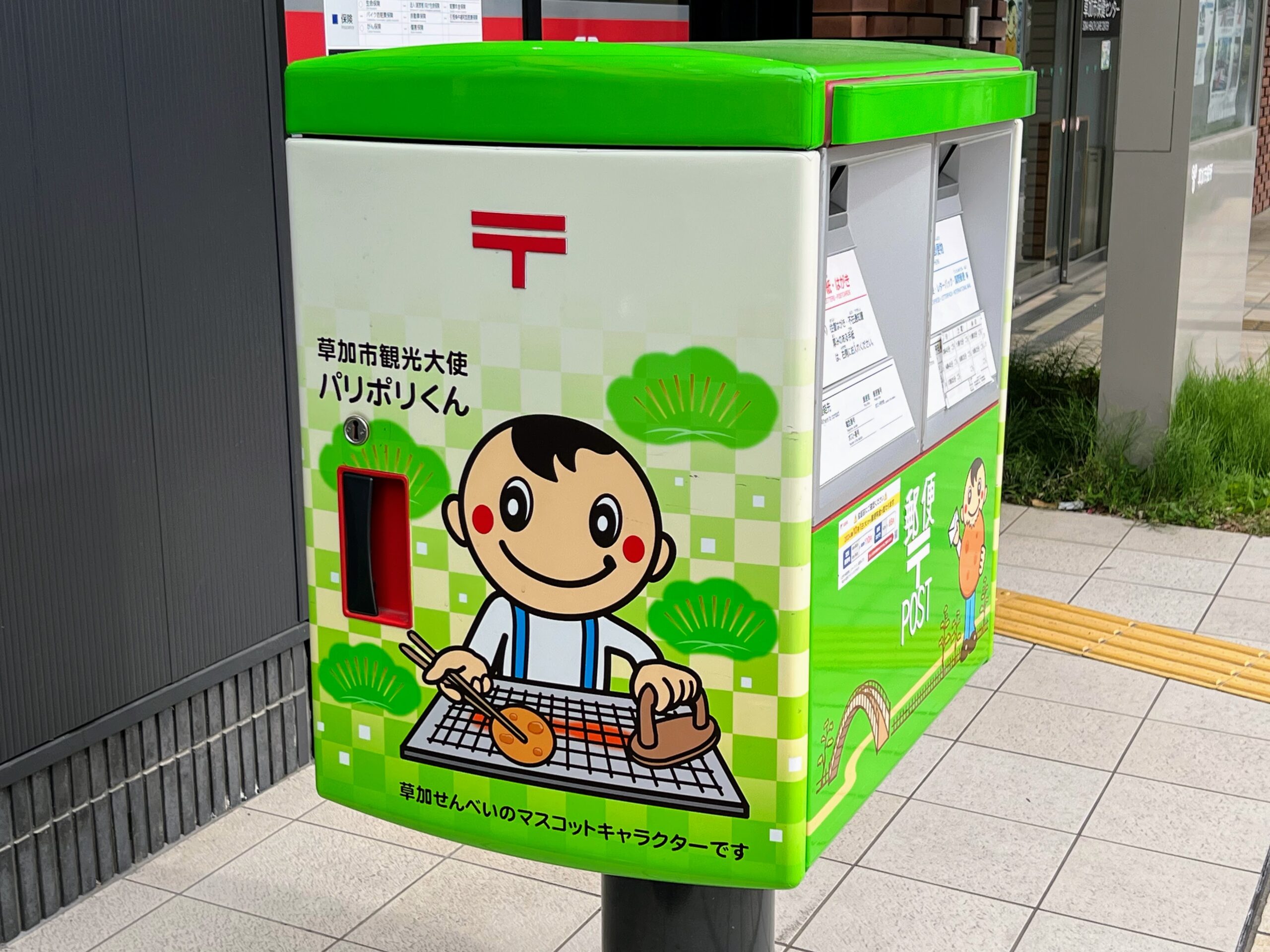 草加せんべいマスコット「パリポリくん」とともに、草加市内の風景(恐らく「百代橋」)や名物「草加せんべい」などが大きく描かれているラッピングポストでございます。2024年1月に設置されたばかりの比較的新しいポストですね。