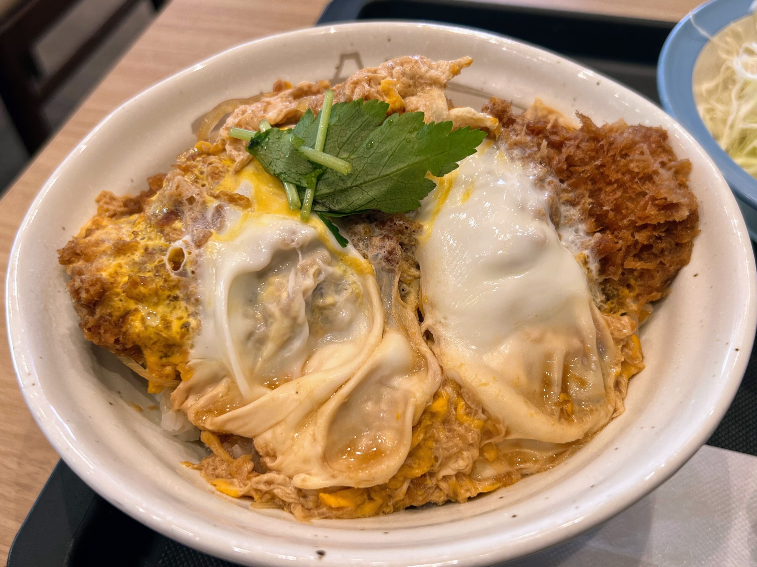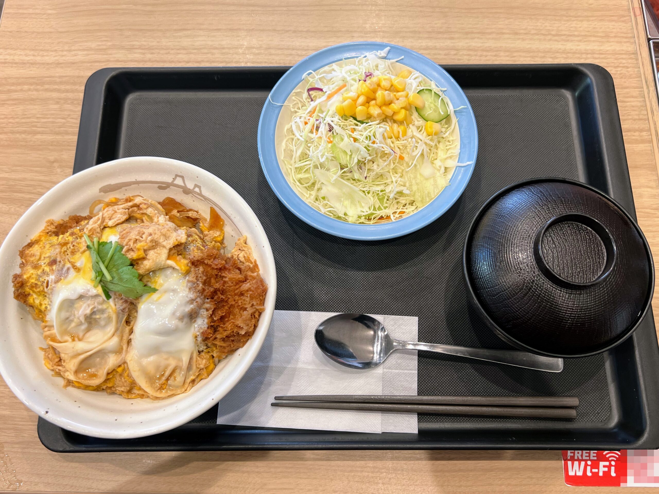 松のやの「親子チキンかつ丼」遠目から・生野菜サラダ付き(松屋・松のや併設店にて)