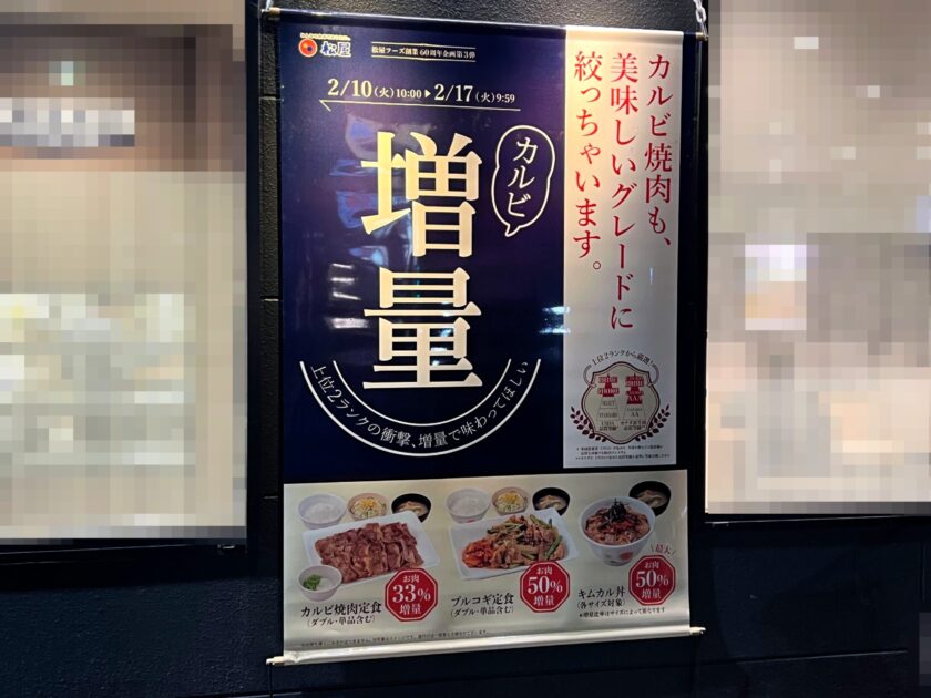 2026年2月10日(火)10時から17日(火)9時59分までの丸1週間、カルビ焼肉定食(他、一部メニュー)が増量中になっているというので食べに行ってみました。