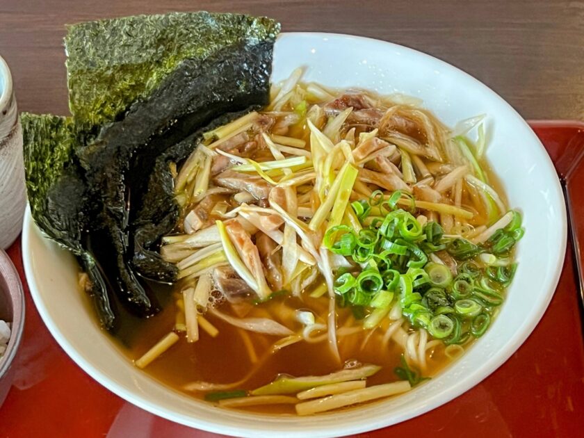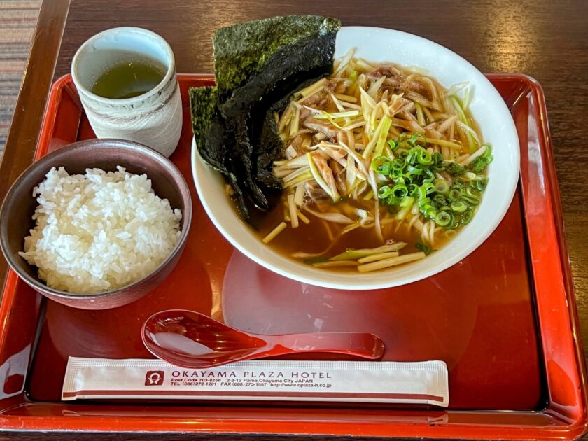 岡山の数ある名産のうちの1つ「黄ニラ」を、たっぷりのネギ、細切りチャーシューとともに、昔ながらの中華そばのスタイルでいただくという、素晴らしい一杯でございます。ネギやニラが苦手でなければ、この上なく美味しくいただけるに違いありません。そもそもレストランが岡山の有名ホテル「岡山プラザホテル」による運営のため、質の高さも納得でございます。
