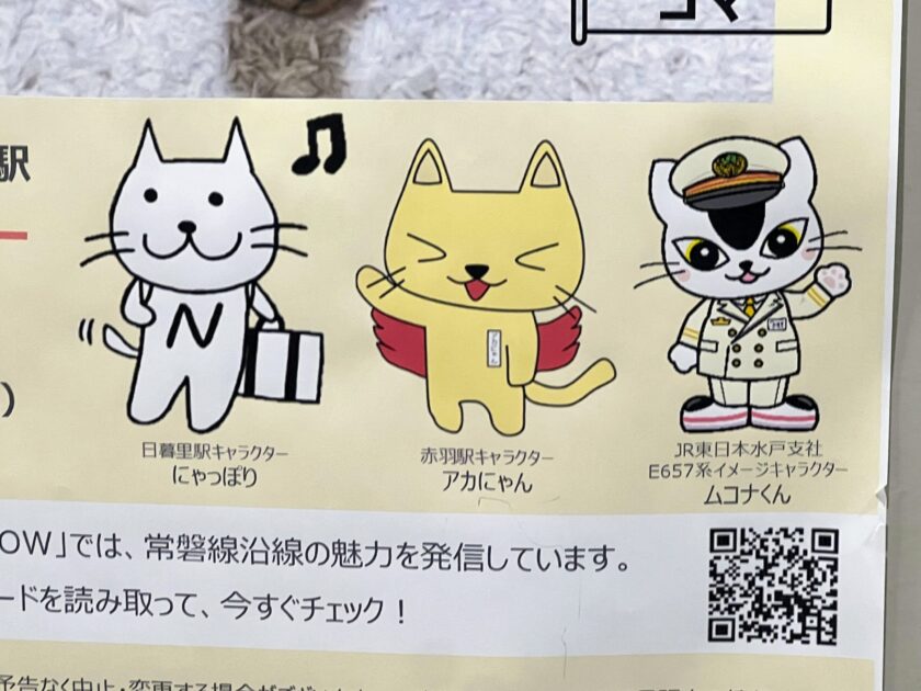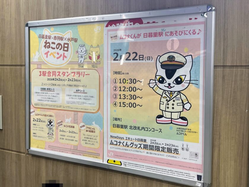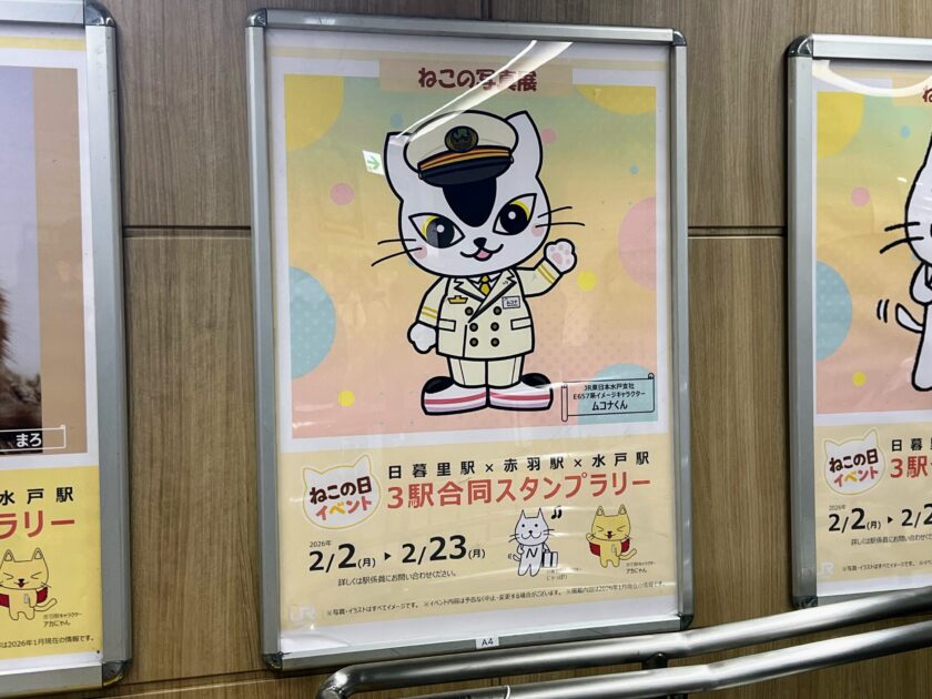 こちらは、JR東日本の日暮里駅、赤羽駅、水戸駅の3駅で明日23日(月)まで実施されている「猫の日」コラボイベントの一環として実施されました。昨年までは日暮里駅と赤羽駅の2駅のみで実施されていたコラボでしたが、今年は水戸支社も巻き込んでの開催となったのですね。そういうわけで「ムコナくん」も日暮里駅に呼ばれたようです。