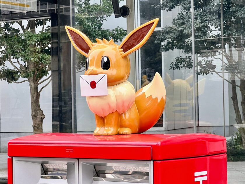 ピカチュウ(オス、メス)のポストとイーブイのポストが並べて置かれております。両方とも、郵便ポストにふさわしく、封筒を持っている(口に咥えている)のがはっきりと分かります。