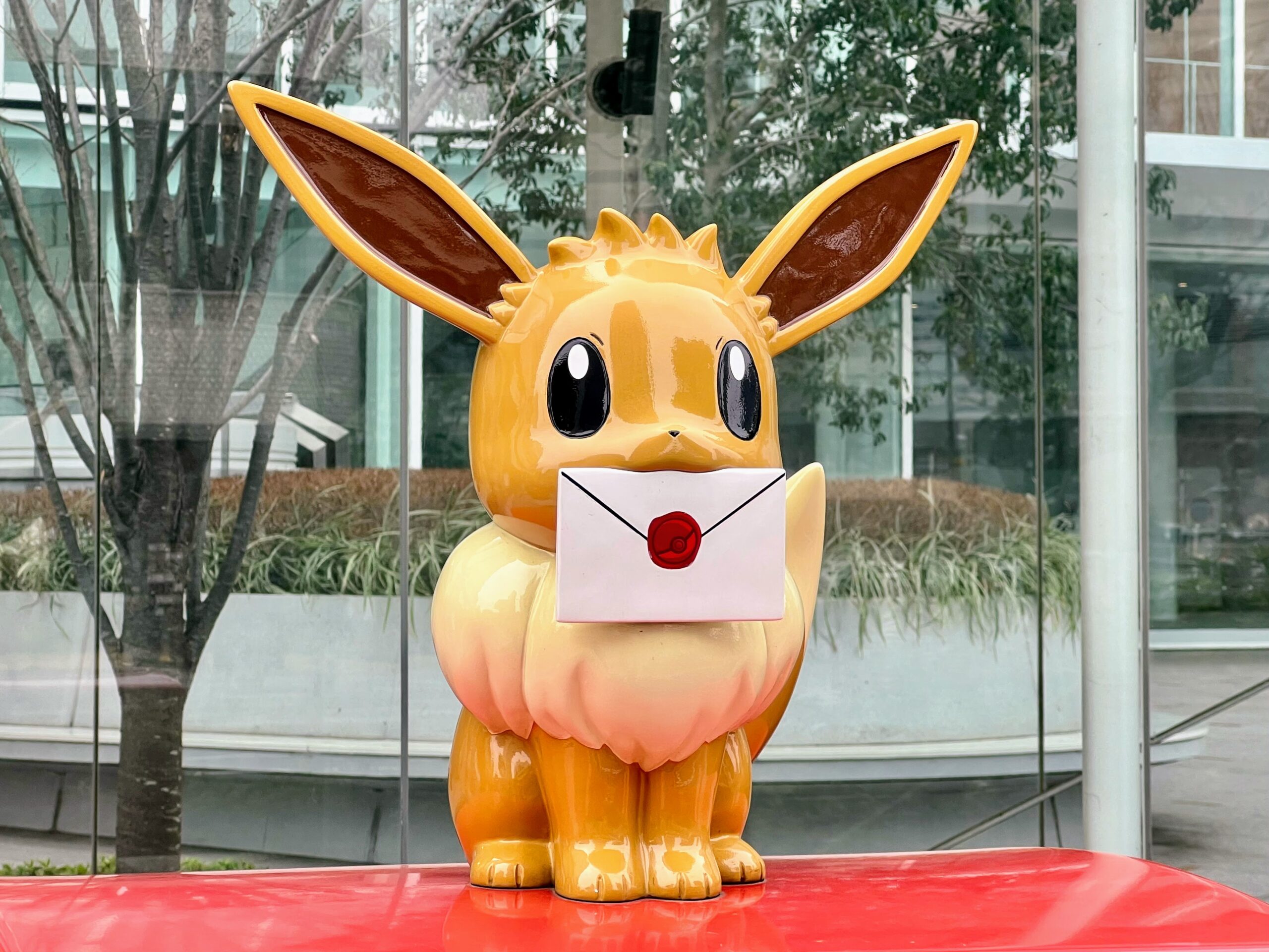 ピカチュウ(オス、メス)のポストとイーブイのポストが並べて置かれております。両方とも、郵便ポストにふさわしく、封筒を持っている(口に咥えている)のがはっきりと分かります。