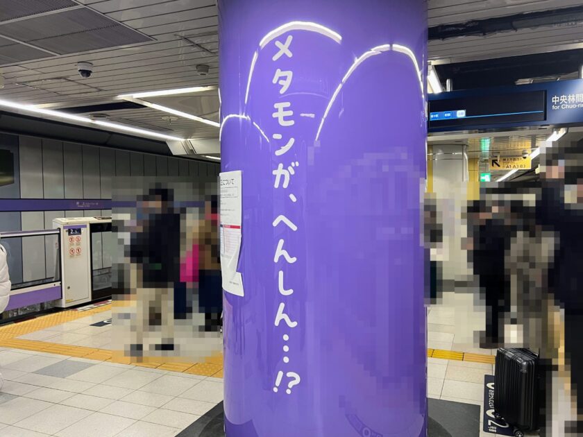 今回私が回ったのは半蔵門駅押上駅、しかもホーム内のみですが、スペースの周りにはメタモンを見ようと足を運んでいる方々も結構いらっしゃいました。ただ、渋谷駅だと一般の乗客もたくさんいるので、見るだけでもかなり苦労しそうです。広告のデザインもほぼ同一のようなので、無理に全駅見る必要もないと思います。少なくとも、じっくり見るだけなら半蔵門駅で問題なさそうですね。