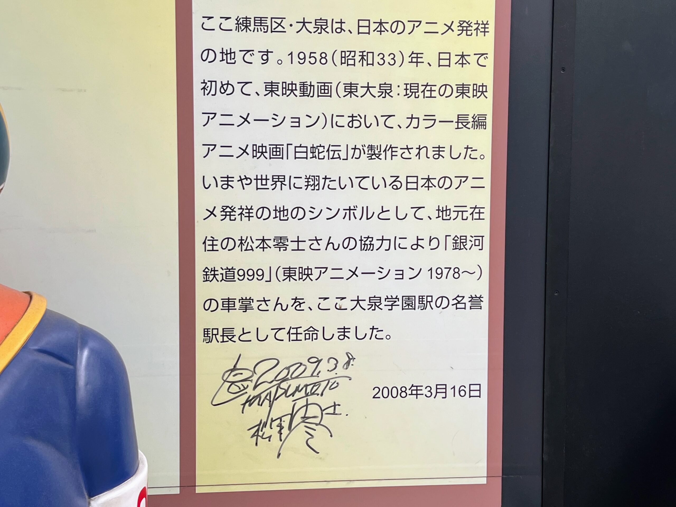 なお、松本零士氏の直筆サインも書き添えられていますが、数字で「2009.3.8」と書かれており、設置後しばらくしてから追記されたものと思われます。