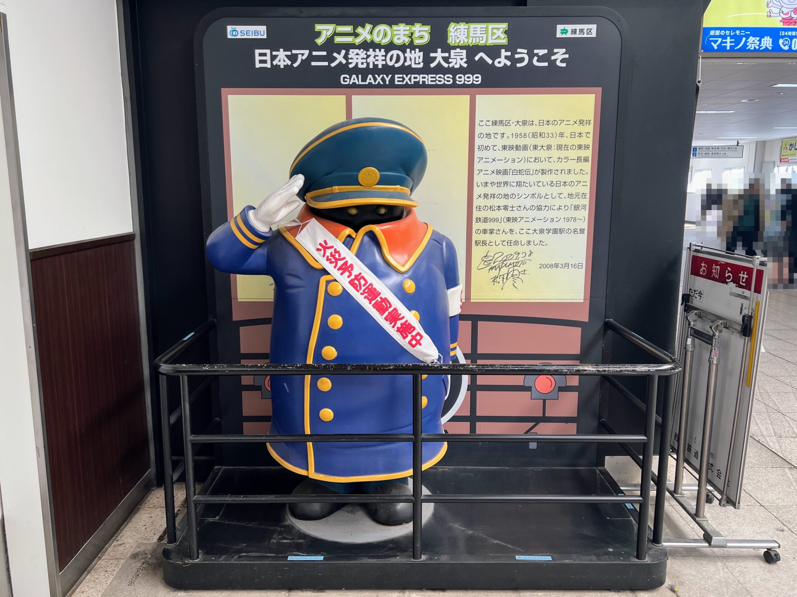 ここ練馬区・大泉は、日本のアニメ発祥の地です。1958(昭和33)年、日本で初めて、東映動画(東大泉:現在の東映アニメーション)において、カラー長編アニメ映画「白蛇伝」が製作されました。いまや世界に翔たいている日本のアニメ発祥の地のシンボルとして、地元在住の松本零士さんの協力により「銀河鉄道999」(東映アニメーション 1978~)の車掌さんを、ここ大泉学園駅の名誉駅長として任命しました。
