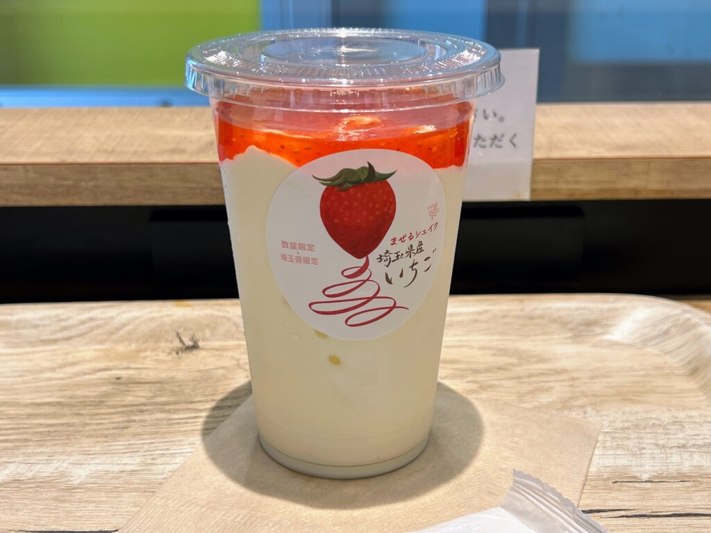 【モスバーガー】地産地消で地域貢献、プレミアムいちご県の底力。「まぜるシェイク 埼玉県産いちご」(2025年7月撮影)【期間限定】