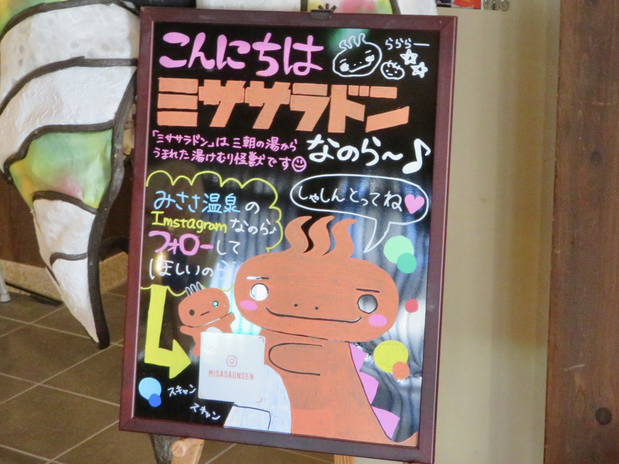 このキャラクターは、三朝温泉のご当地キャラ「湯けむり怪獣 ミササラドン」というそうで、なぜか有袋類で子育て中、とのことらしいです。キャラクターデザインは公募で決定されたとのこと。