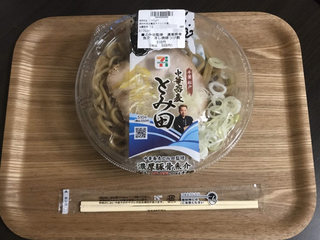 【セブンイレブン】「中華蕎麦とみ田監修 濃厚豚骨魚介冷し焼豚つけ麺」(2019年7月撮影)【過去の販売商品】