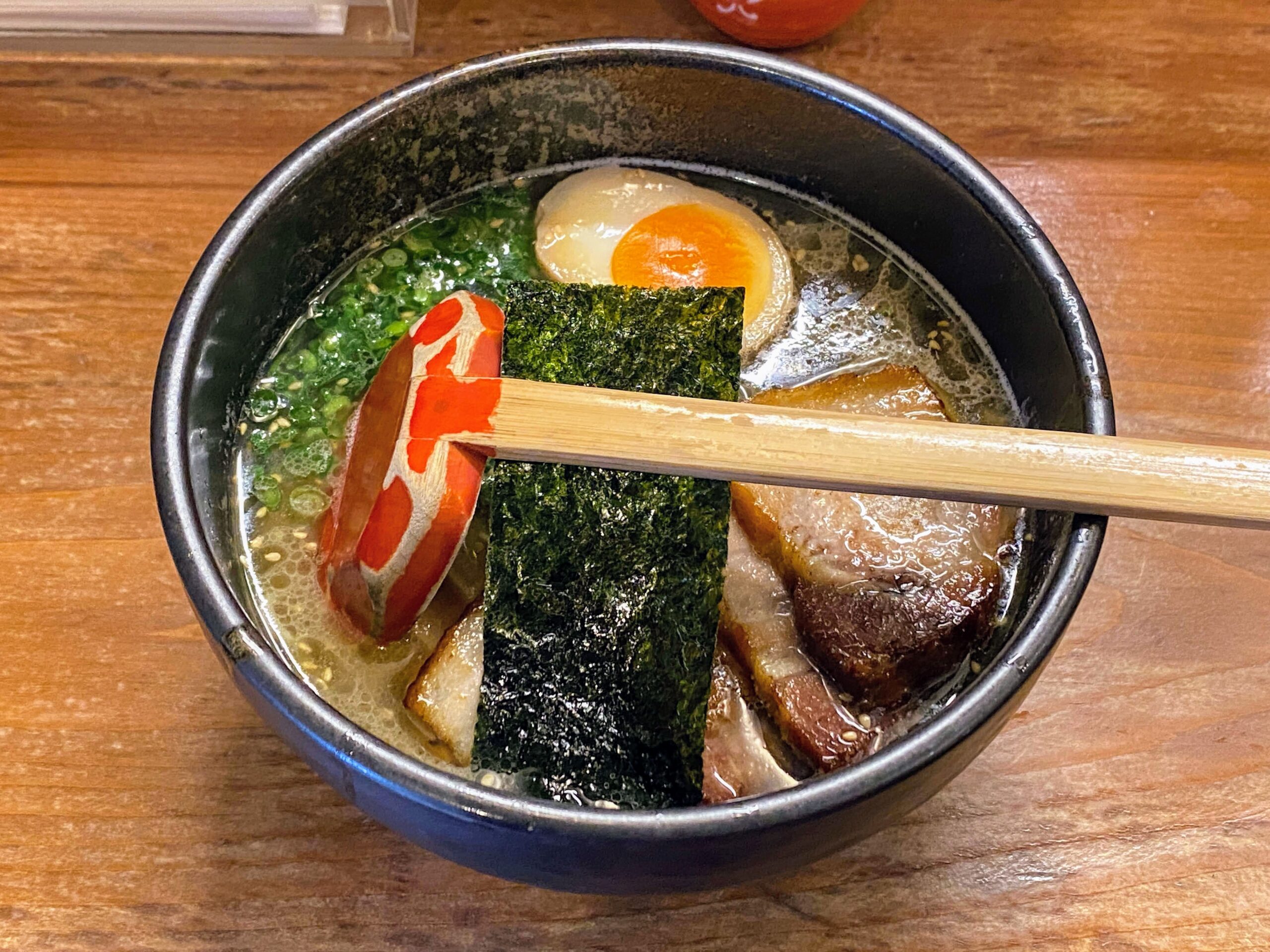 そんなスープに中太麺はバッチリと合いますし、炙りチャーシューや味玉といったトッピングもよく仕上がっていたと思います。ほどよくまとまっていて、本当に贅沢な一杯でございました。